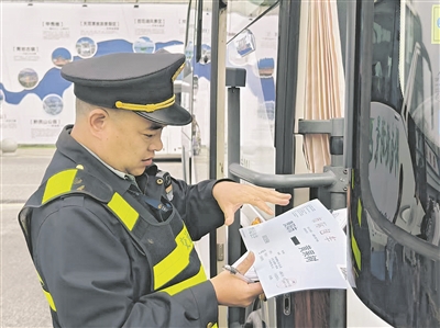 图为11月3日,交通运输执法人员对客运汽车进行检查。