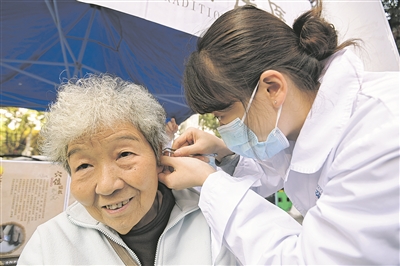 日前,南明区油榨街道联合贵州中医药大学第二附属医院、贵阳爱尔眼科医院、贵阳市南明区中医医院等多家医疗机构开展“温情暖重阳 义诊送健康”活动,为辖区老年人提供疾病诊察、用药指导、健康宣教等贴心的健康服务。图为医务人员为辖区老年人进行耳穴贴压治疗。
