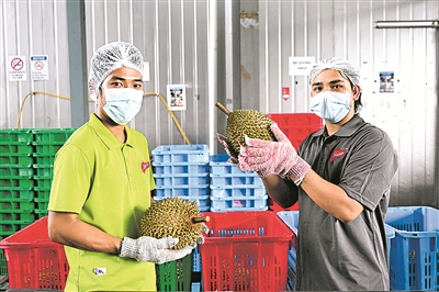 工作人员在马来西亚雪兰莪州的一家榴莲加工厂检查榴莲(2025年10月16日摄)。