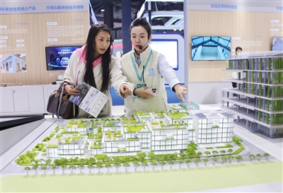 11月6日,讲解员(右)在住博会上向观众介绍展出的节能建筑。 新华/传真