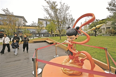 11月2日,人们从成都天府长岛数字文创园的哪吒雕塑旁走过。