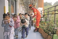 全国消防日将至,各地开展丰富多彩的消防宣传教育活动,以提高人们的消防安全意识和自防自救能力。 图为11月7日,开阳县第二幼儿园小朋友参加应急逃生演练。 新华/传真