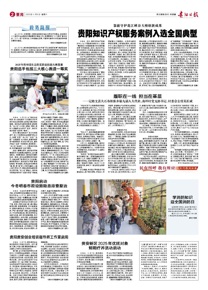 本报讯 近日,贵阳市知识产权保护中心(以下简称贵阳保护中心)凭借“靠前服务 助推国家重点项目高质量发展”的实践经验,成功入选2025年全国专利预审工作典型案例和经验做法。该实践经验中,贵阳保