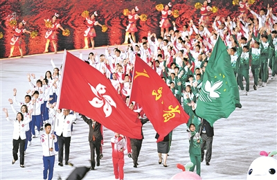11月9日,广东省体育代表团、香港特别行政区体育代表团和澳门特别行政区体育代表团在入场仪式上共同入场。 新华/传真
