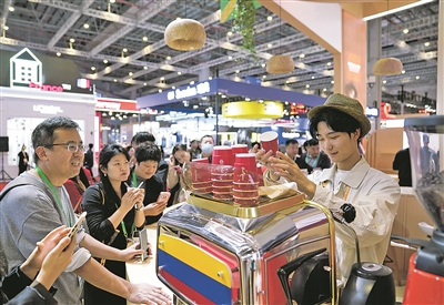 2025年11月5日,人们在第八届进博会国家展哥伦比亚馆排队品尝咖啡。