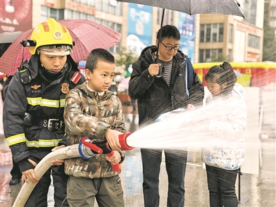 11月9日,一名小朋友在活动现场体验用消防水带“灭火”。