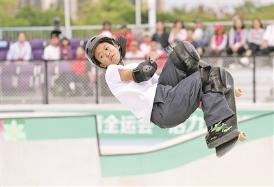 滑板赛场更是少年天下。当天决出的4枚金牌中的3枚被青少年选手获得,摘得奖牌的12人中有9人尚未成年。当天年龄最小的冠军产生在女子碗池,13岁的广东选手邹明珂以0.32分的微弱优势反超12岁的山东选手孟令妍,拿下金牌。