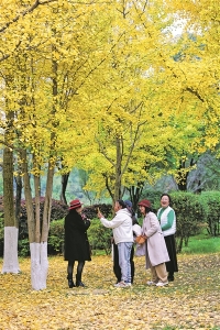 时下虽已立冬,但观山湖公园却是一幅多彩的景象,梧桐、银杏、水杉等高大乔木及灌木的树叶纷纷呈现出秋冬季节里特有的色彩,放眼望去,每一处都如一幅油画。 图为11月11日,市民在观山湖公园赏景