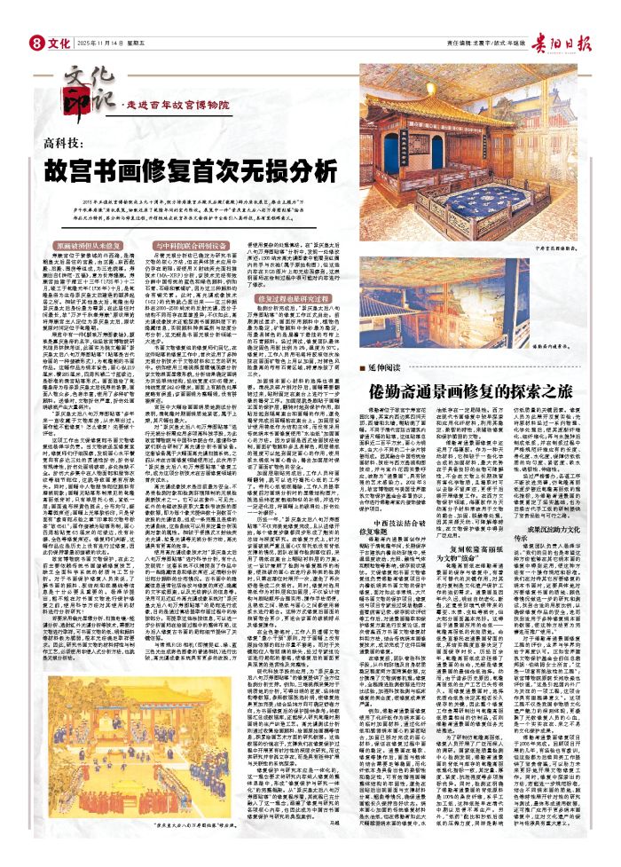 倦勤斋位于故宫宁寿宫花园北端,其室内西边第四间天顶、西墙和北墙,糊贴满了画幅。不同于清代宫廷古建筑内普通尺幅的贴落,这组贴落总面积近二百平方米,画心为绢本,由大小不同的二十余片拼接而成。因其融