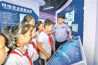 ◀2025年9月15日,浙江省舟山市岱山县公安局民警与辖区高亭中学学生进行网络安全知识竞答互动。 新华/传真