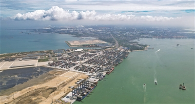 巨轮靠泊,岸桥繁忙作业……海南洋浦国际集装箱码头一派忙碌有序的景象。