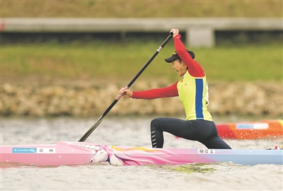 11月19日,第十五届全国运动会皮划艇静水项目女子200米单人划艇决赛在广州举行,贵州队选手帅常文夺得冠军。图为11月19日,帅常文在比赛中。