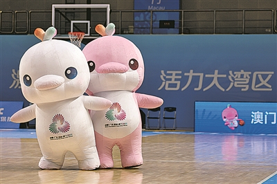 11月16日,在第十五届全国运动会澳门赛区篮球比赛场馆,吉祥物在比赛中场休息时表演。