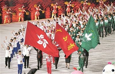 11月9日,广东省体育代表团、香港特别行政区体育代表团和澳门特别行政区体育代表团在第十五届全国运动会开幕式上共同入场。