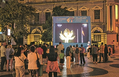 11月9日,第十五届全国运动会开幕式在广东奥林匹克体育中心举行,这是群众在澳门街头观看直播。