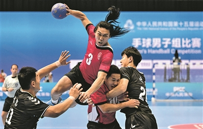 11月10日,在香港举行的第十五届全国运动会手球男子铜牌赛中,香港队球员陈梓朗(上)在比赛中攻门。