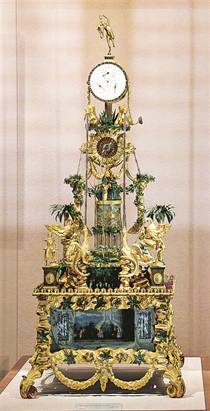 展出的铜镀金乐箱水法跑人双马驮钟。