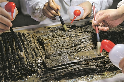 文保人员正在进行竹简保护工作。 江西省文物考古研究院/供图