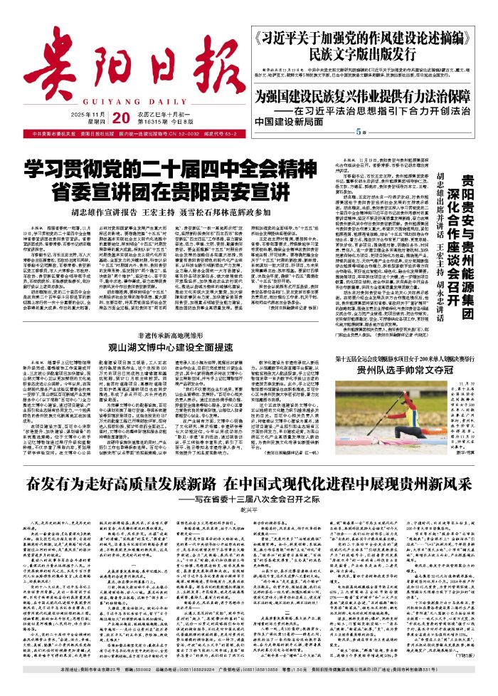 本报讯 根据省委统一部署,11月19日,学习贯彻党的二十届四中全会精神省委宣讲团在贵阳贵安宣讲。省委宣讲团成员、省委常委、市委书记胡忠雄作宣讲报告。 市委副书记、市长王宏主持,市人大常