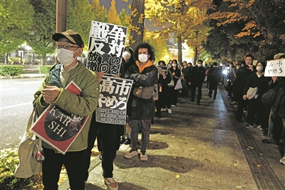 数百名日本民众21日晚在位于东京的首相官邸前举行集会,抗议日本首相高市早苗近日在国会发表的涉台错误言论,要求其撤回相关表态并作出解释和道歉。 新华/传真