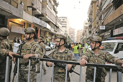 图①:11月23日,在黎巴嫩首都贝鲁特南郊,黎巴嫩军方人员在遭遇空袭的多层住宅楼附近警戒。 新华/传真
