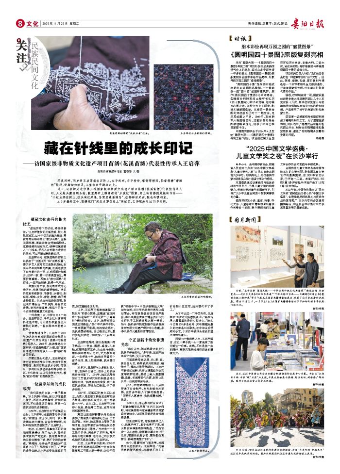 贵阳日报融媒体记者 董容语 文/图 花溪河畔,75岁的王启萍坐在石阶上,左手托布,右手持针,银针穿梭间,忙着刺绣“猪蹄杈”纹样,针脚细如蚊足,工整密布于麻布之上。 近日,记者初见这