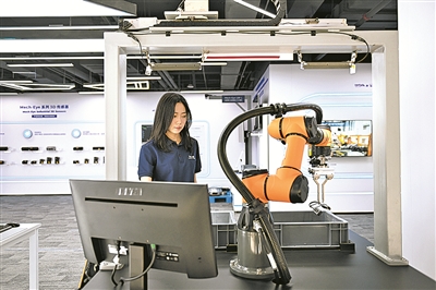 2025年3月26日,在雄安新区中关村科技园,梅卡曼德(北京)机器人科技有限公司工作人员在演示工业机器人运行。