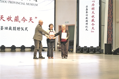 捐赠仪式现场,贵州省博物馆向乐苹(中)、汤丹(右)颁发捐赠证书。