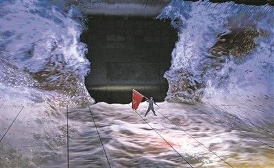 红旗下,一边是红军战士手握长枪,张口挥臂,似乎呼喊着战斗口号前进;另一边,构皮滩水电站的建设者们,手执勘测仪器,灼灼目光投向远方。