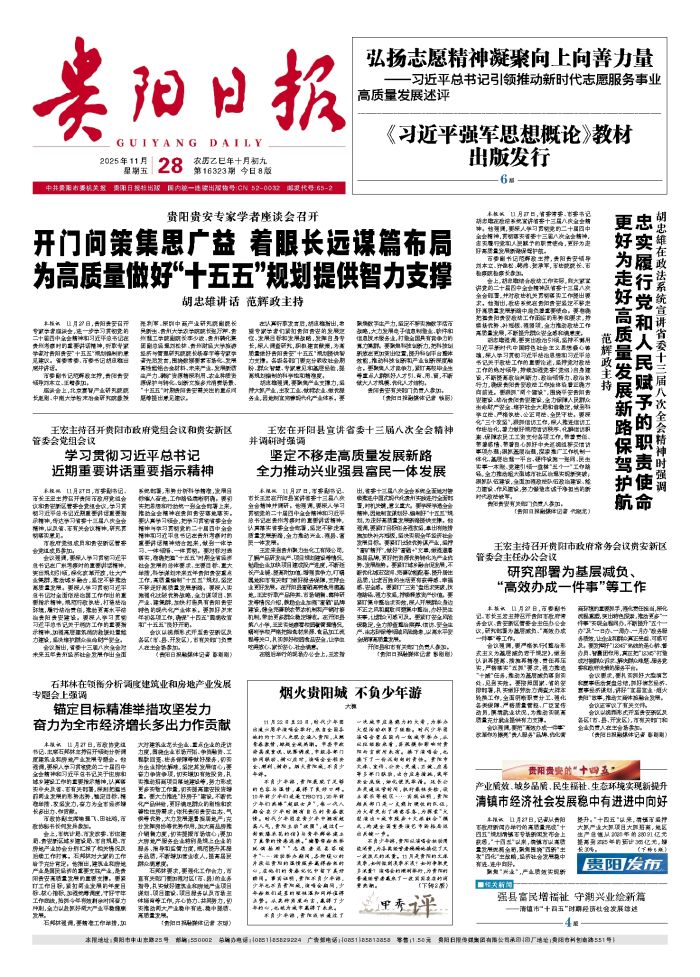 本报讯 11月27日,贵阳贵安召开专家学者座谈会,进一步学习贯彻党的二十届四中全会精神和习近平总书记在贵州考察时的重要讲话精神,听取专家学者对贵阳贵安“十五五”规划编制的意见建议。省委常委、