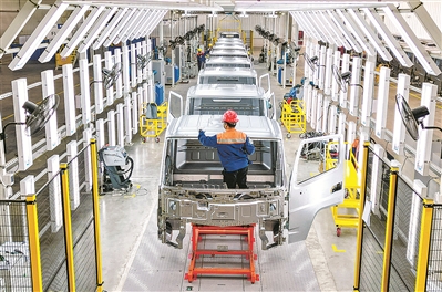 工人在贵州长江汽车焊装车间忙碌。