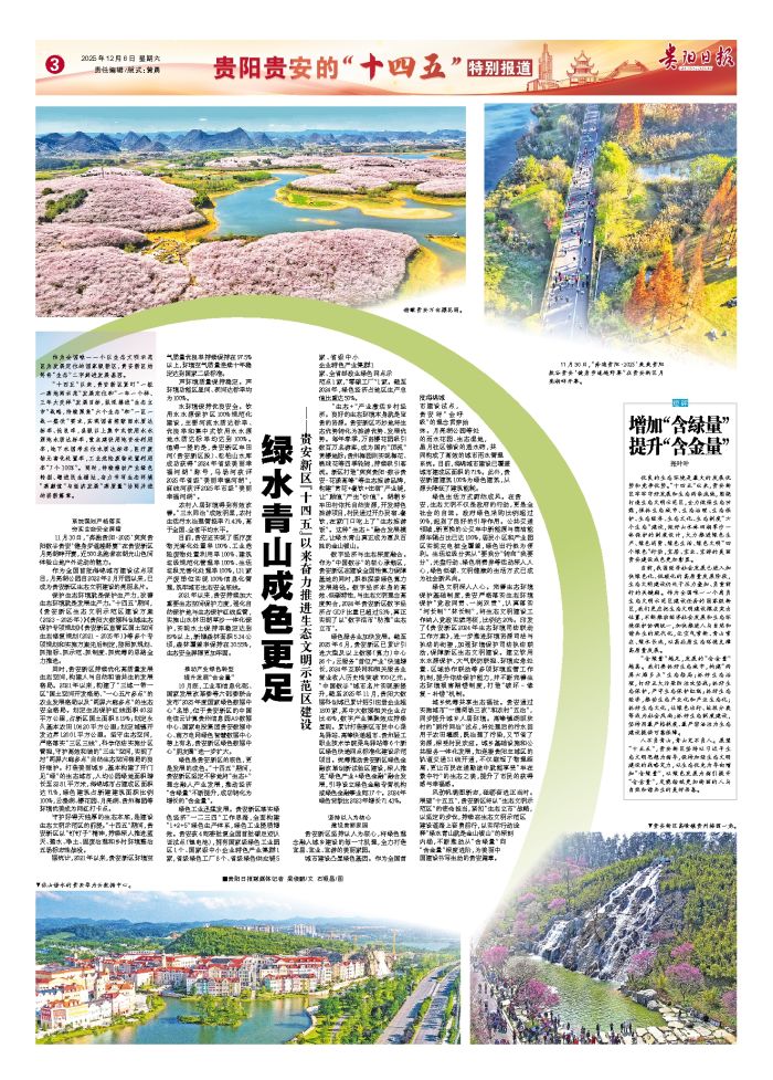 作为全国唯一一个以生态文明示范区为发展定位的国家级新区,贵安新区始终将“生态”二字刻进发展基因。 “十四五”以来,贵安新区紧盯“一极一高地两示范”发展定位和“一年一个样、三年大变样”发展