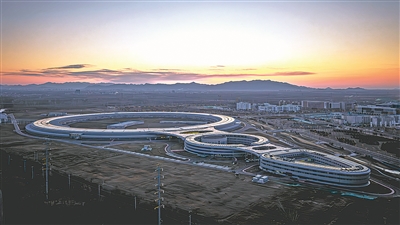 国家重大科技基础设施——高能同步辐射光源(HEPS)于2025年3月27日正式启动带光联调,HEPS建设进入冲刺阶段。图为晨光下的高能同步辐射光源(无人机照片,2024年12月27日摄)。 新华/传真