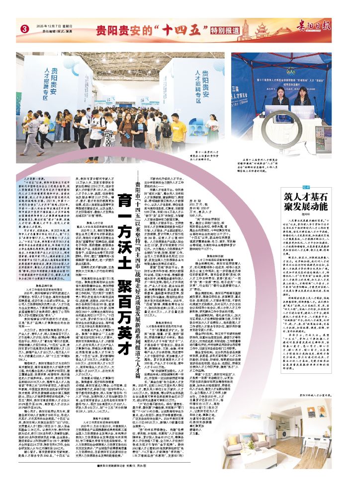 人才是第一资源。 “十四五”以来,贵阳市坚持以习近平新时代中国特色社会主义思想为指导,深入贯彻落实习近平总书记关于做好新时代人才工作的重要思想和中央、省委决策部署,把人才作为推进中国式现