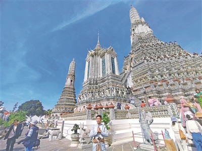 黎明寺又称郑王庙,由驱逐缅军建立吞武里王朝的华裔将领郑信(原名郑昭)重修。郑信去世后,百姓为纪念他,称黎明寺为郑王庙,其核心建筑中使用了大量中国彩瓷和中式雕像。图为黎明寺一景。