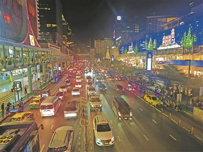 入夜,曼谷街头车水马龙、流光溢彩。
