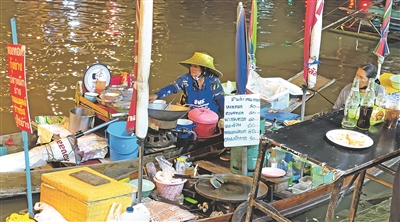夜功府的安帕瓦水上市场位于美攻河支流,每周五至周日开放,河道两侧分布着传统商铺,水面上停泊着售卖食品的小艇。图为一名泰国妇女(左)驾艇在市场上销售当地小吃。 黎清馨 摄