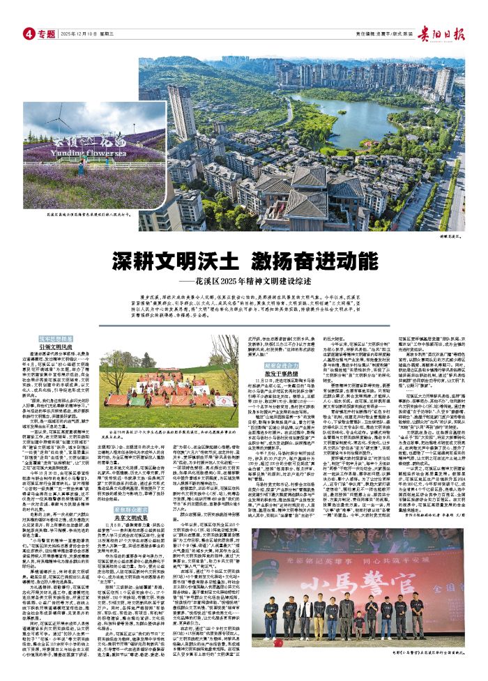 漫步花溪,浑然天成的美景令人沉醉,但真正拨动心弦的,是那浸润在风景里的文明气象。今年以来,花溪区紧紧围绕“凝聚群众、引导群众、以文化人、成风化俗”的目标,聚焦文明培育、文明实践、文明创建“三文
