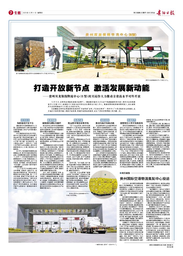 12月10日,贵州国际空港物流集配中心同步揭牌投运。作为贵州双龙保税物流中心(B型)的功能延伸与协同发展项目,该集配中心的启用,标志着贵州双龙航空港经济区在构建“空中丝绸之路”枢纽进程中又落下
