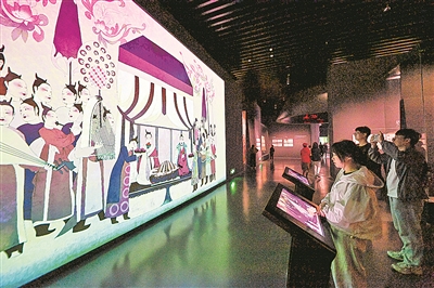 《宴饮图》还被搬上互动投影墙,游客拨动琵琶弦,便可与乐伎共奏一曲,还可以通过操作电子屏幕答题,触发图中乐手演奏笛子,极大地增强了观展的趣味性和互动性,让游客拥有“人在画中游”的奇妙体验。