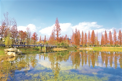 冬日,花溪湖公园的树木“换装”,与一汪碧水相映成趣,宛如一幅绚丽多姿的山水画卷,吸引众多游客前往打卡游览,感受别样浪漫。