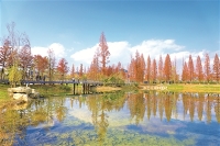 冬日,花溪湖公园的树木“换装”,与一汪碧水相映成趣,宛如一幅绚丽多姿的山水画卷,吸引众多游客前往打卡游览,感受别样浪漫。 图为12月12日,游客在花溪湖公园游玩。 贵阳日报融媒体记