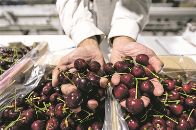 2024年1月4日,工人在智利拉斯卡夫拉斯市的水果包装厂内展示车厘子。