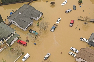 图为12月16日,在美国华盛顿州太平洋城,房屋和车辆浸泡在洪水中(无人机照片)。