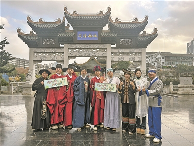 话剧《心光——王阳明传奇之龙场悟道》剧组演员在“城南胜迹”牌匾前合影。