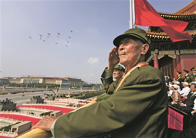2025年9月3日,纪念中国人民抗日战争暨世界反法西斯战争胜利80周年大会在北京隆重举行。这是抗战老战士在天安门城楼上敬礼。
