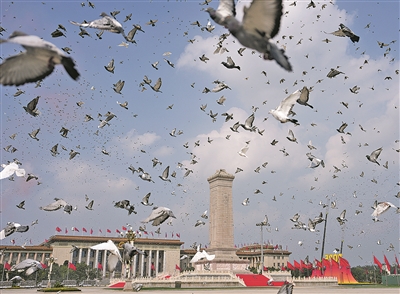 2025年9月3日,纪念中国人民抗日战争暨世界反法西斯战争胜利80周年大会在北京隆重举行。这是纪念大会现场放飞鸽子。