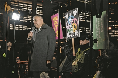 12月23日,在日本东京的首相官邸前,上智大学教授中野晃一在抗议集会上发言。 新华/传真