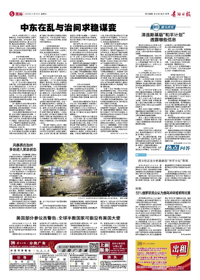 2025年,在美国支持之下,以色列肆意出击,中东多地冲突频仍,动荡不定,凸显安全困境。百年变局中,地区国家探索谋求共同安全,着力自主发展,推动全球治理变革。中国坚定为中东人民争公道、争和平、争发展,积极劝和促谈,开展务实合作,交流治国理政经验,为促进中东实现和平稳定、发展振兴贡献正能量。