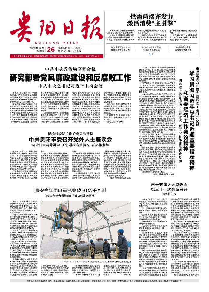 本报讯 12月25日,市委常委会和贵安新区党工委召开会议,学习贯彻习近平总书记近期重要指示精神和省委经济工作会议精神,分析2025年贵阳贵安经济运行情况、研究2026年经济工作,研究调度党内